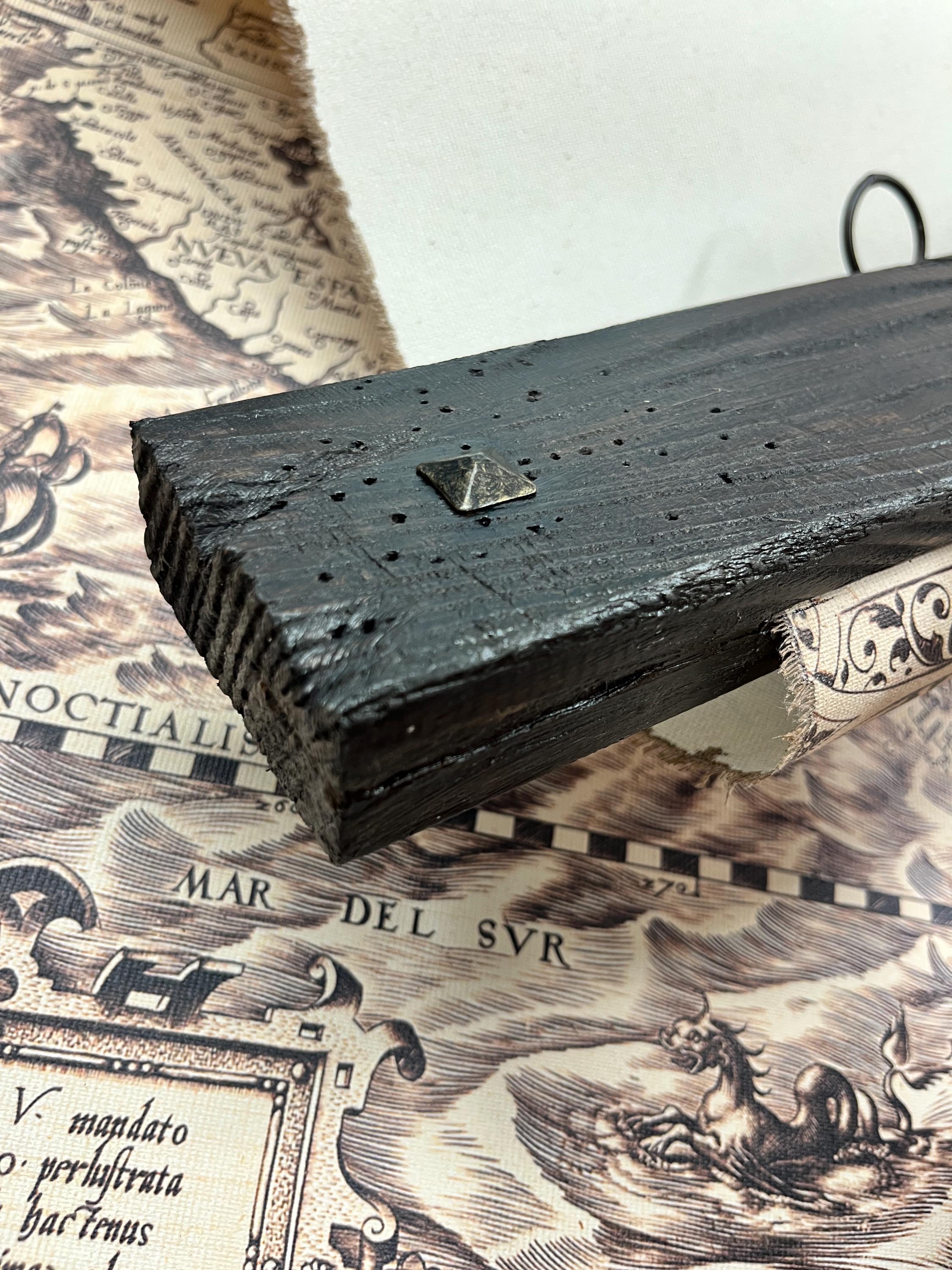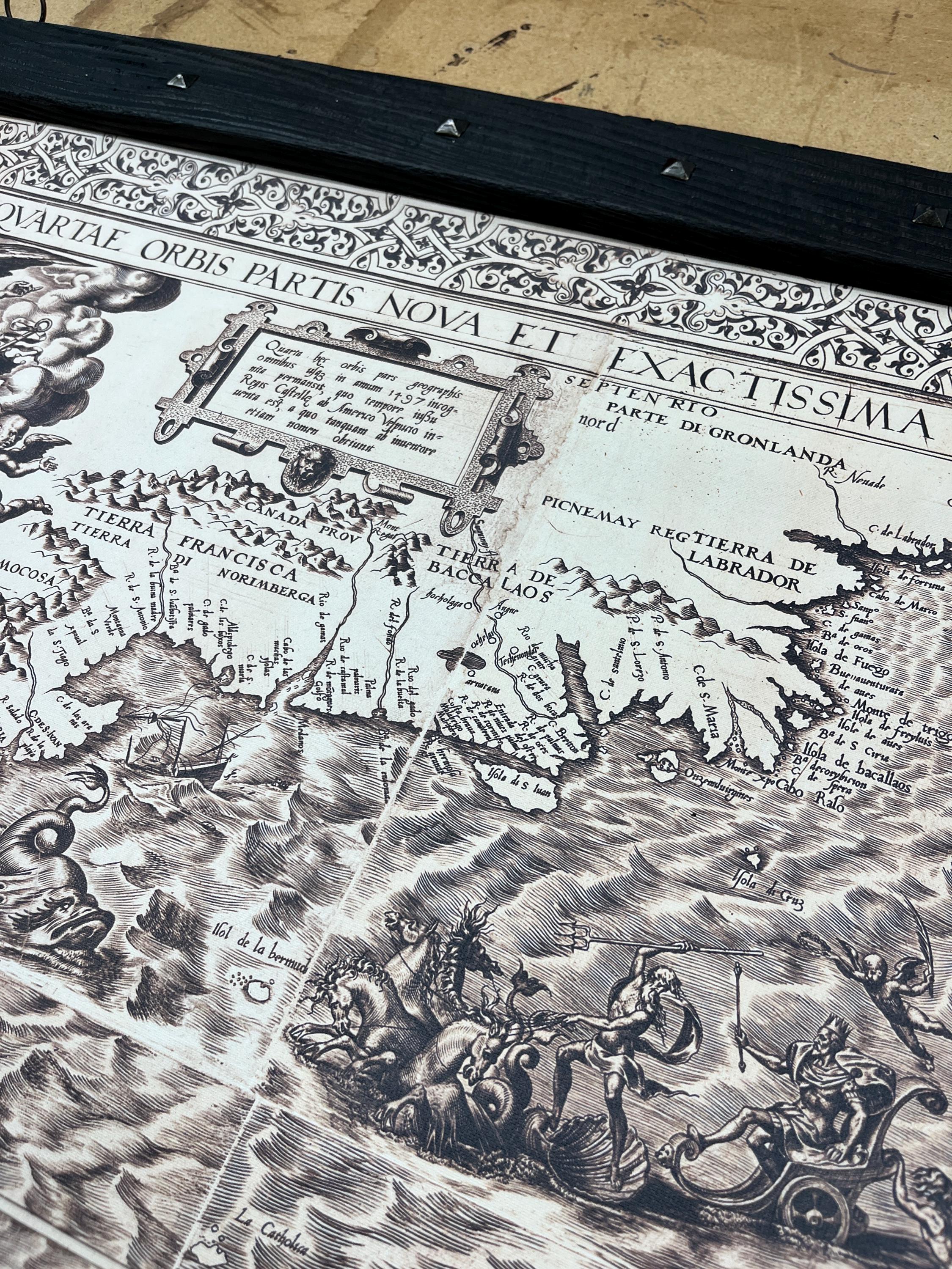 1) Please choose canvas size from the dropdown menu. Canvas map will be equiped with same hardware and antique wood as the map shown in photos. Wood is about 4'' / 9cm over the canvas size. Production time is about 10 days.