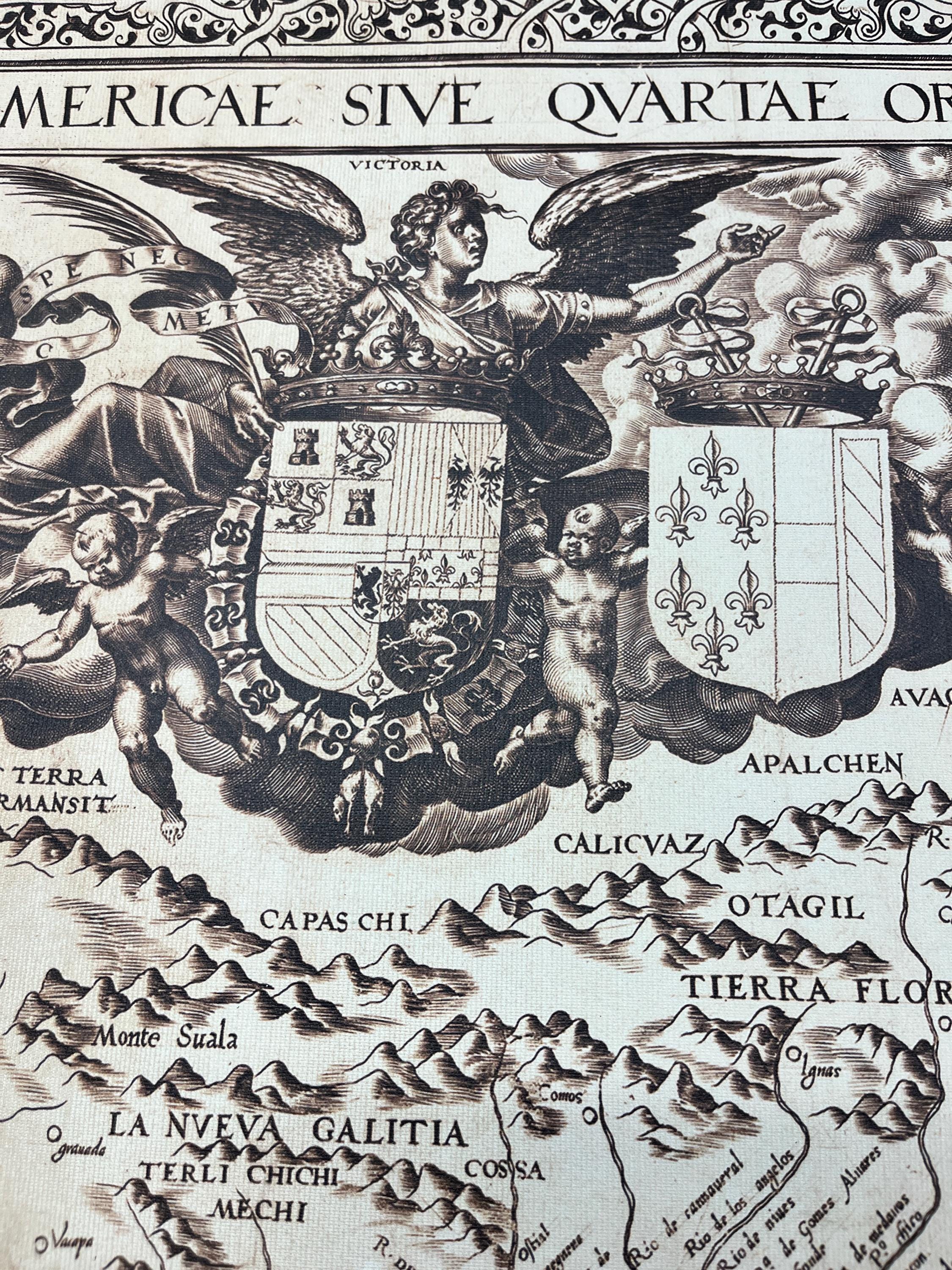 Americae Sive Quartae Orbis Partis Nova Et Exactissima Descriptio (Latin: A New and Most Exact Description of America or The Fourth Part of the World) Ornate geographical map of the Americas, made in 1562 by Spanish cartographer Diego Gutiérrez and Flemish artist Hieronymus Cock. The map encompasses the eastern coast of North America, the entire Central and South America and parts of the western coasts of Europe and Africa. Americae Sive Quartae Orbis Partis Nova Et Exactissima Descriptio is the earliest scale wall map of the New World and the first to use the name "California"