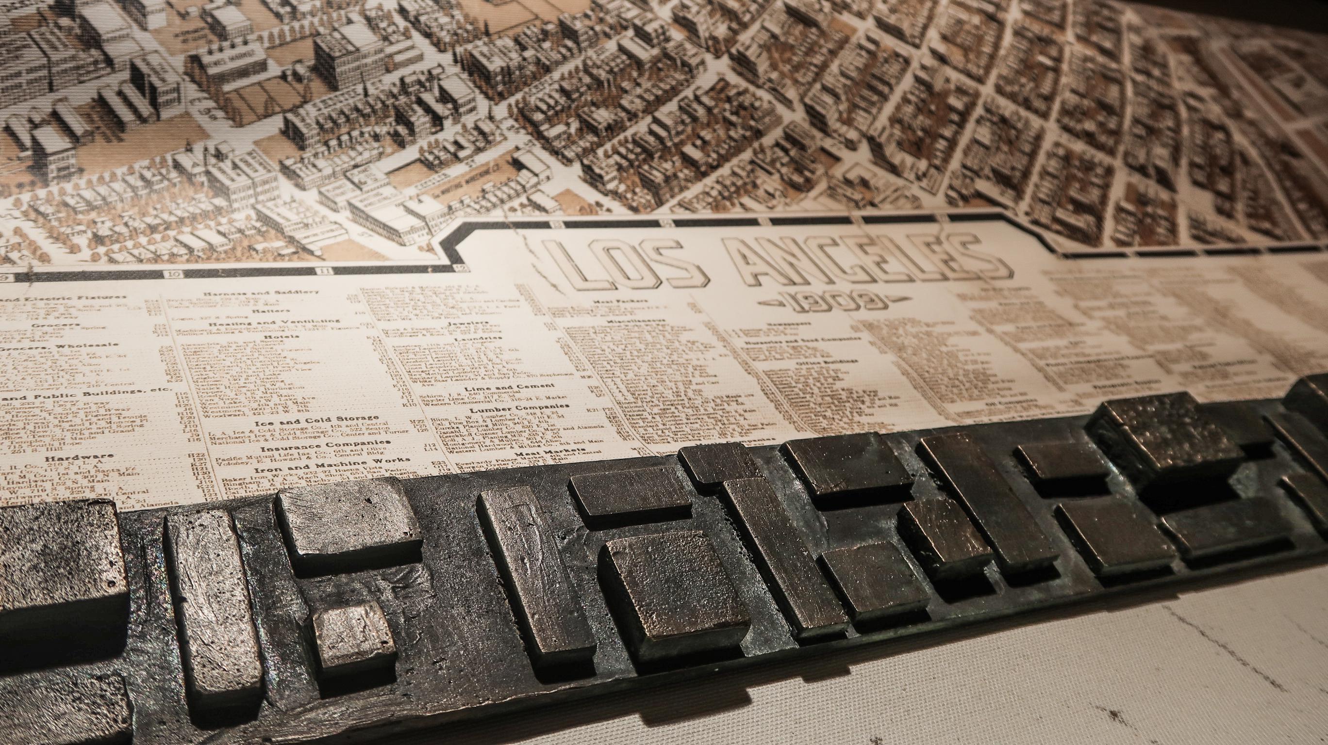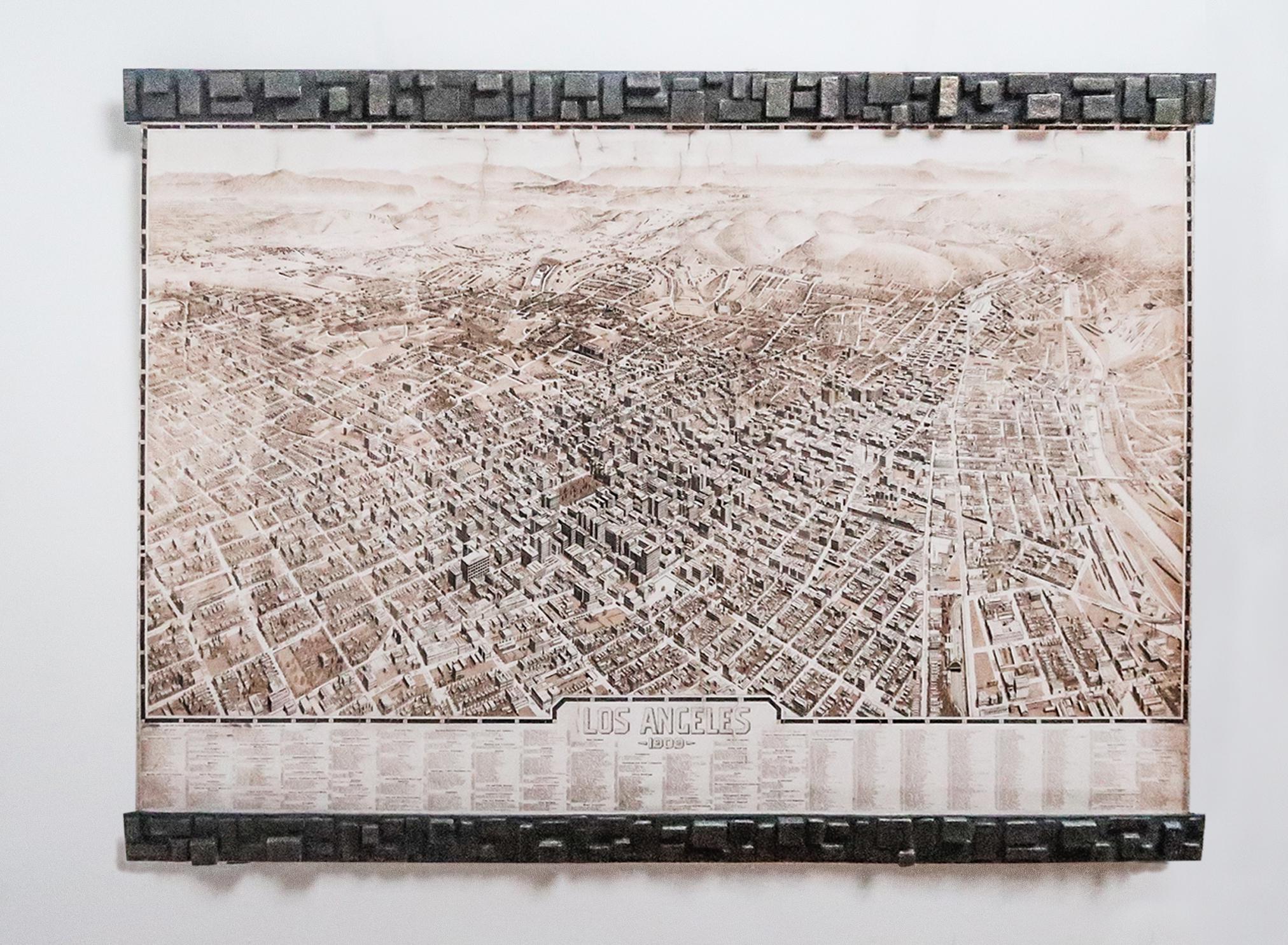 Canvas map showing Los Angeles, heavy cast bronze frame.